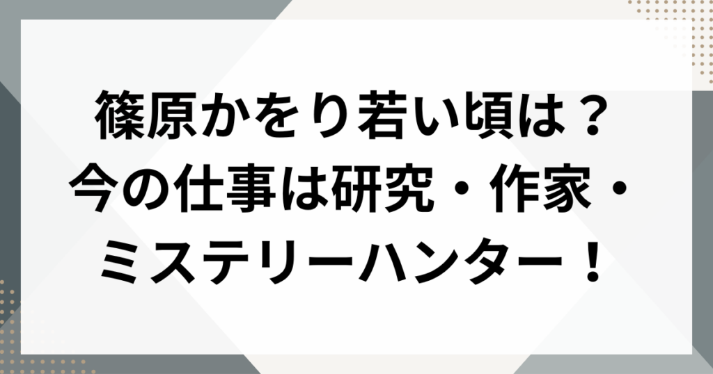 ミステリーハンターとして有名な篠原かをりさん。 そんなタレントの篠原かをりさんですが、若い頃はどうだったのか、気になりますよね。 また、篠原かをりさんの今の仕事は、研究・作家・ミステリーハンターだそうですが、どうなんでしょうか? そこで、今... -